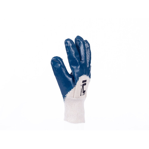 • ökölcsontig nitrilbe mártott kék védőkesztyű pamut kesztyűalapon, rugalmas mandzsettával