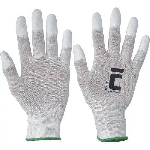 • kötött, varratmentes nylon kesztyű vékony poliuretán bevonatú ujjhegyekkel és rugalmas mandzsettával
