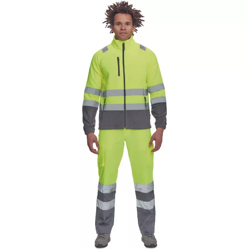 • Hi-Vis férfi polár pulóver 5 cm széles fényvisszavető csíkokkal • cipzáras kivitelben • 1 mellkasi és 2 cipzáras oldalzseb • rugalmas mandzsetták, a pulóver alja húzózsinórral szűkíthető