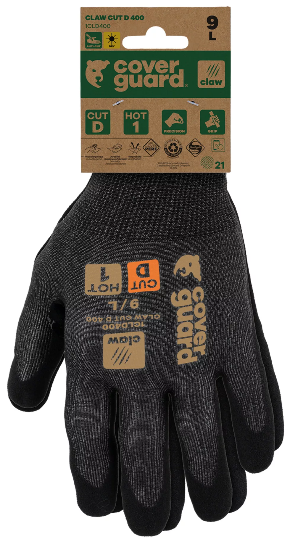 A CLAW CUT D 400 újrahasznosított poliészterből készül, és RCS tanúsítvánnyal rendelkezik (a termék összsúlyának 20%-a újrahasznosított alapanyagból áll).