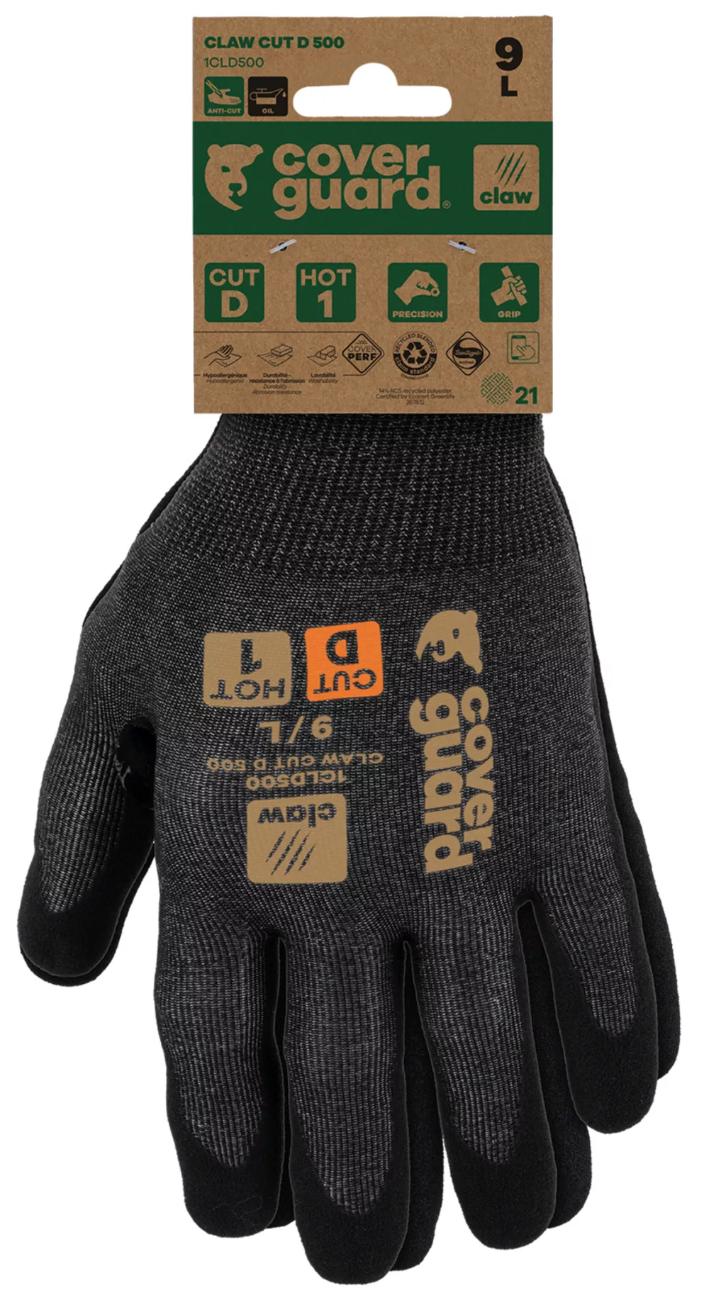 A CLAW CUT termékcsalád egy új generációs vágásálló kesztyű, amelyet azért fejlesztettek ki, hogy megvédjen a legigényesebb munkák során, magas vágásállósági szinttel (CUT D-től A9-ig), és kiváló kényelmet, valamint kivételes ügyességet biztosítson minden munkakörnyezetben (száraz, nedves és olajos).A CLAW CUT D 500 modellt finom anyagmozgatási munkákhoz tervezték száraz és olajos környezetben. A magas 21-es kötés, amely egy rendkívül puha és erős üvegszál, poliészter és spandex alapú anyagból készült, második bőr érzést nyújt, miközben kiváló vágásvédelmet biztosít (CUT D).A tenyér nitrillel bevont, dupla rétegű, szemcsézett / homokszerű felülettel rendelkezik, vízálló, és a hüvelykujj és a mutatóujj közötti hosszú megerősítés kiváló tapadást és jó fogást biztosít a legigényesebb munkák során száraz és olajos környezetben, valamint magas szintű kopásvédelmet nyújt (COVERPERF címke: >20.000 ciklus).A CLAW CUT D 500 újrahasznosított poliészter szálból készült, amely RCS tanúsítvánnyal rendelkezik (a termék teljes súlyának 14%-a). Üvegszál nélkül.Ez a kesztyű érintőképernyő-kompatibilis, így viselése közben is használhatja a képernyős berendezéseket. Sanitized kezelés: megakadályozza a baktériumok és szagok fejlődését, és a CLAW CUT D 500 hypoallergén is (COVER