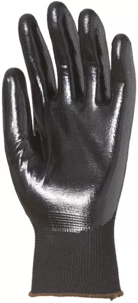 Fekete, varrás nélküli poliészterrel erősített kesztyű, ökölcsontig sima nitrillel mártva, kötött mandzsettával.