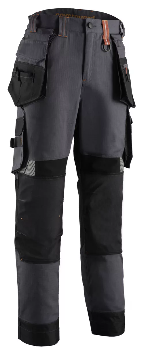 Ripstop: 60% pamut / 40% PES - 280 g/m2 + poliamid / sztreccs betétek + Oxford poliamid/sztreccs - 300D - sötétszürke/narancsMagasított derék10 zseb 2 szerszámtartó hurok Sztreccs betétek: térd felett + térd mögött Oxford sztreccs alapanyagú térdvédő zsebek kontrasztos színek YKK cipzár a sliccen Láthatósági díszcsíkok tripla biztonsági varrás A száron még 5 cm-es lehajtási lehetőségRegular fit EN 14404: Type 2